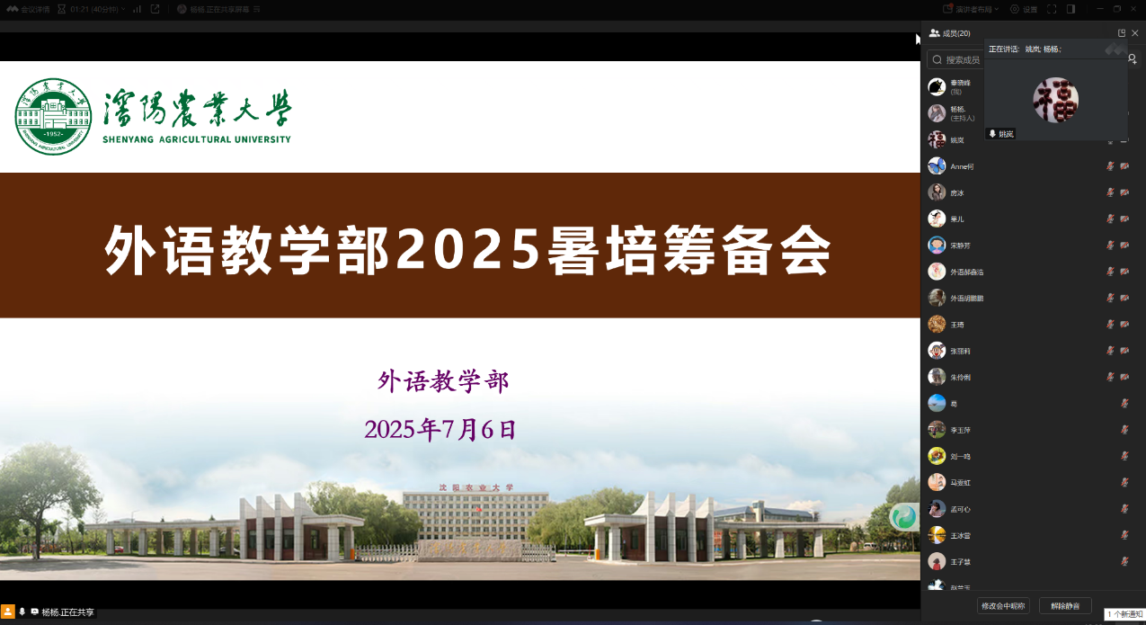 为加强师资队伍建设,提升教师教学科研能力,76日晚,我部通过腾讯会议平台召开2025年暑期培训线上筹备会。会议主管教学副主任杨柳主持,姚岚主任出席会议并作动员讲话,全体参加暑期培训的教师在线参会。