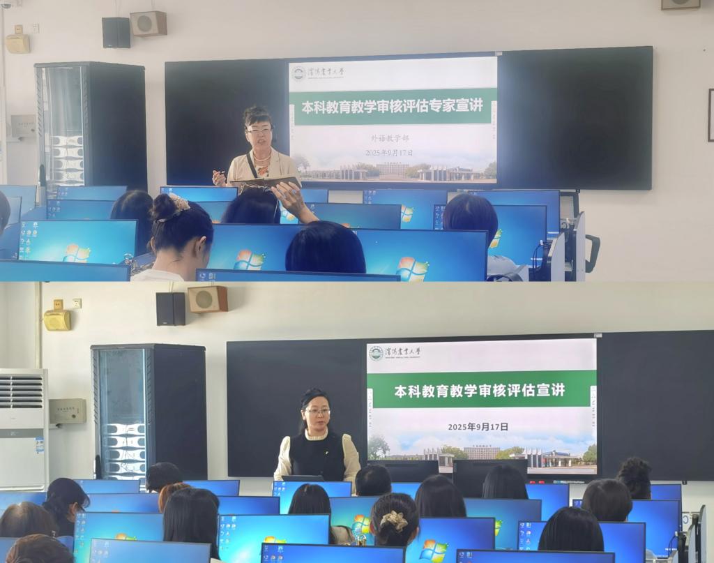 院长围绕新一轮本科教育教学审核评估的核心精神、政策要点、指标体系及迎评重点工作等进行了系统解读,并结合外语学科特点,就评估过程中常见问题及应对策略提出了具体建议。他着重强调了“以学生为中心”“持续改进”等评估理念,帮助与会教师进一步把握审核评估的内涵要求与实施路径以此次评估为契机,全面梳理、补齐短板,推动本科教育教学质量持续提升。